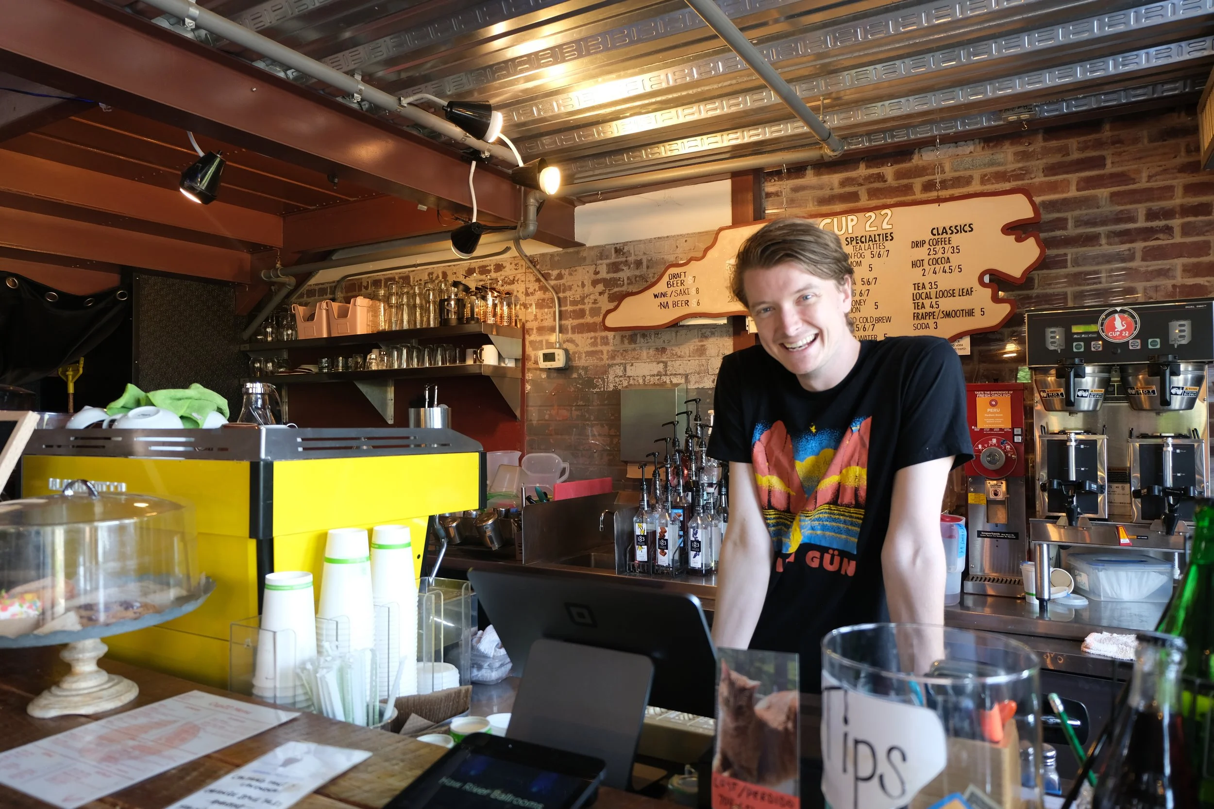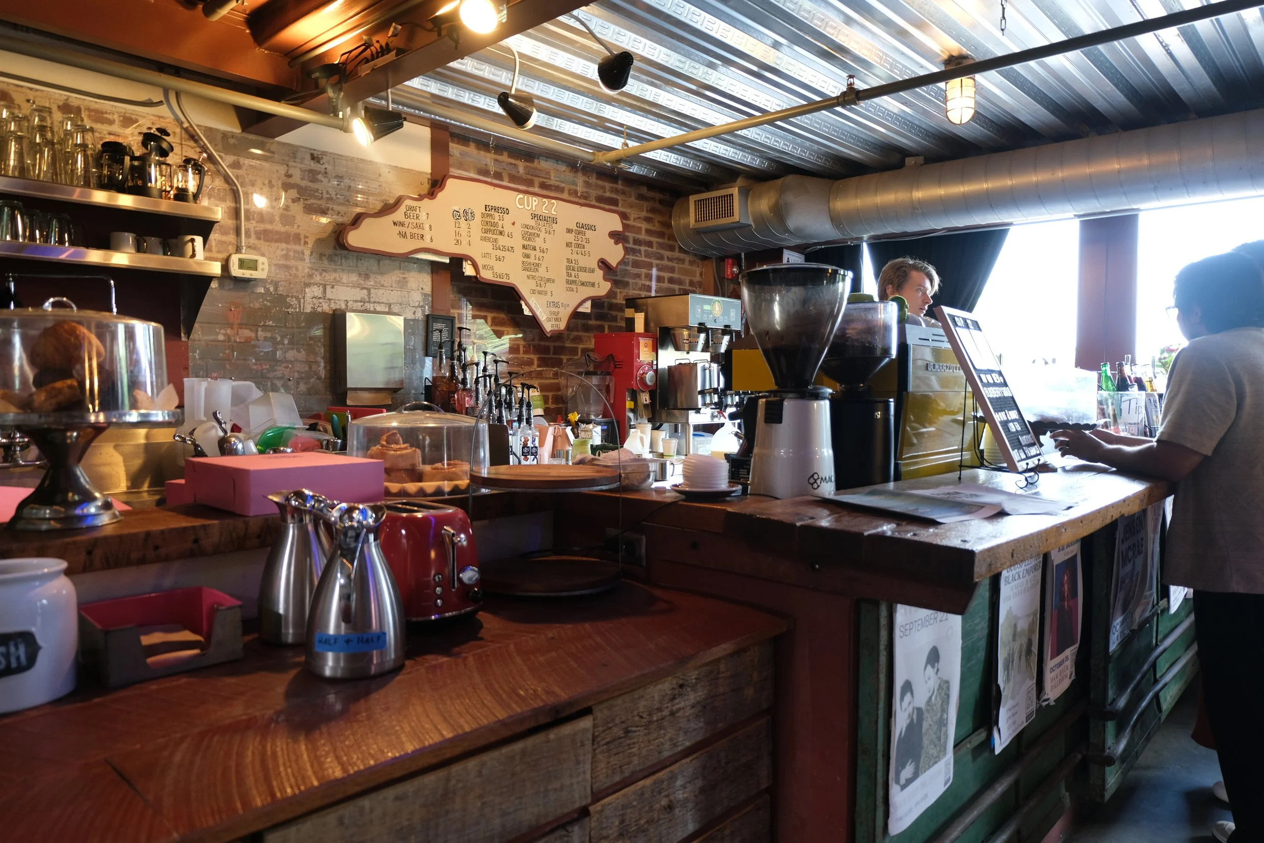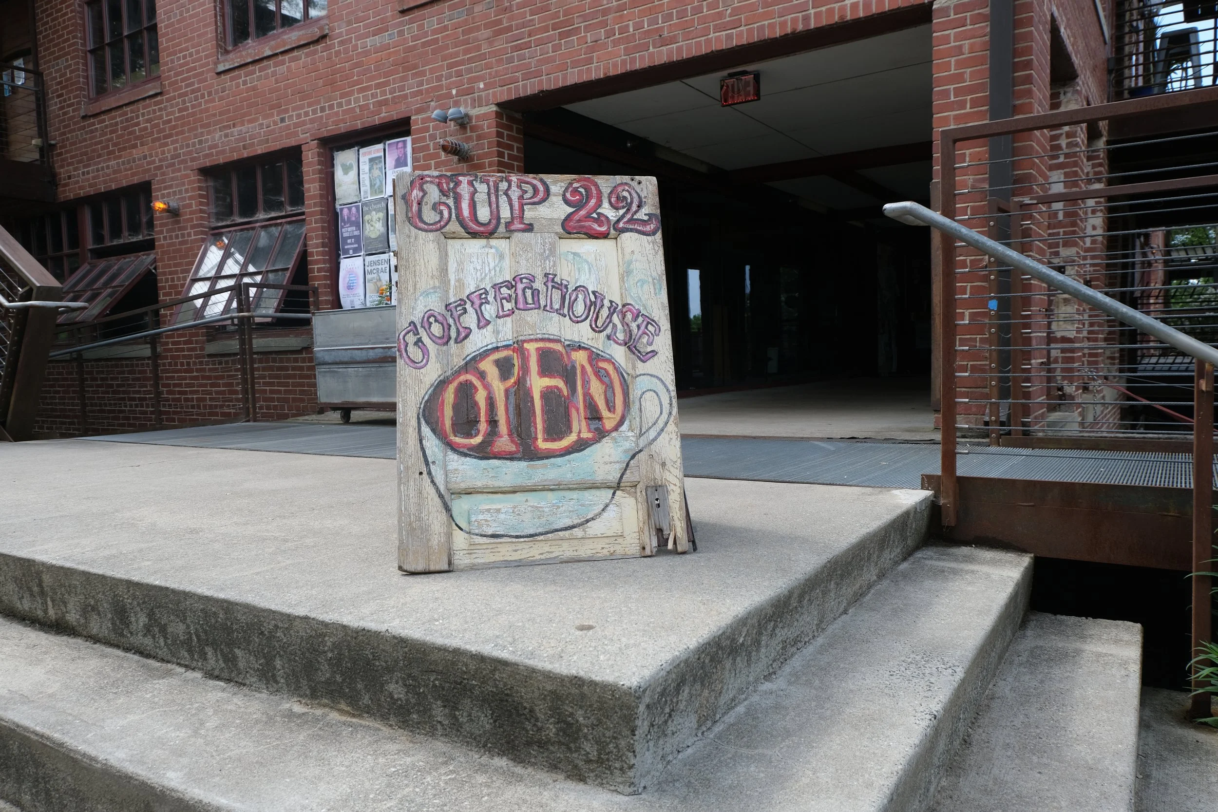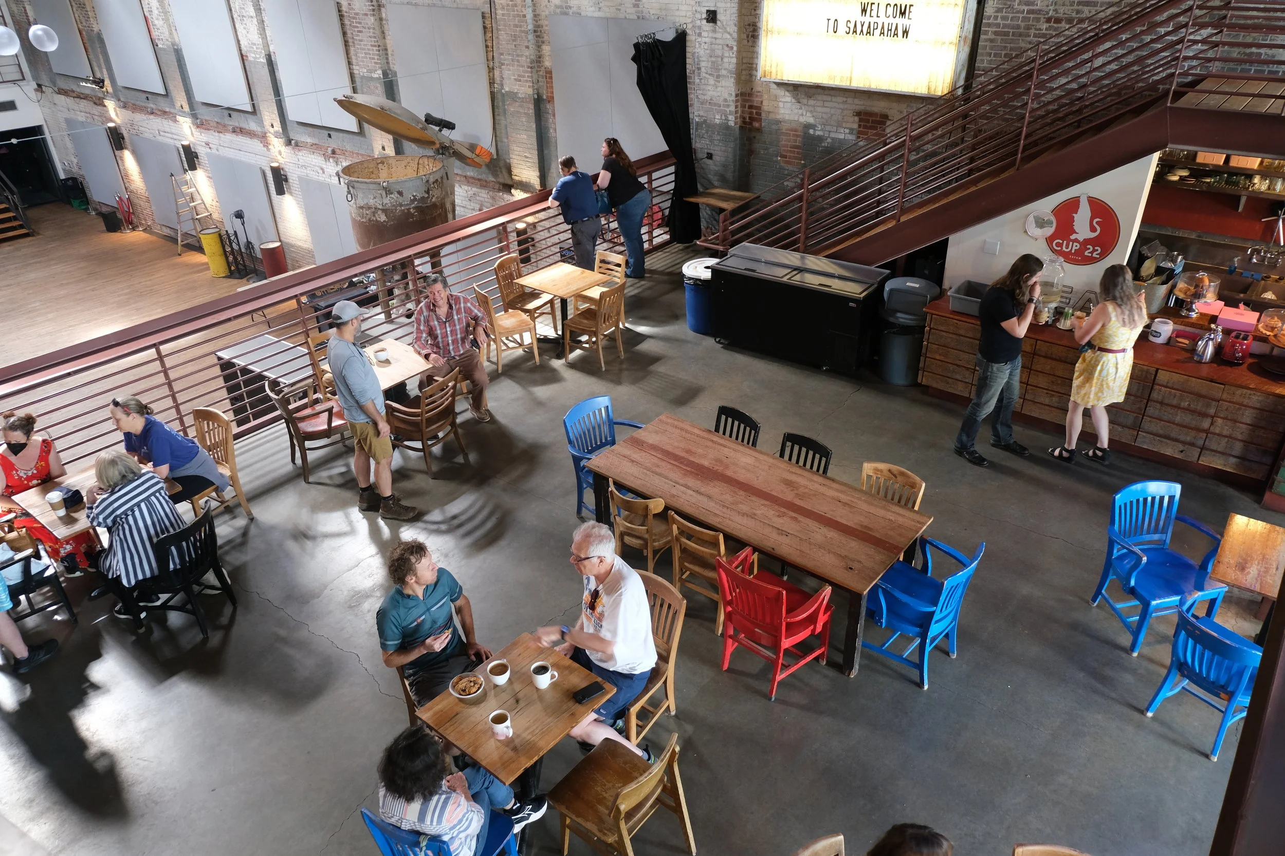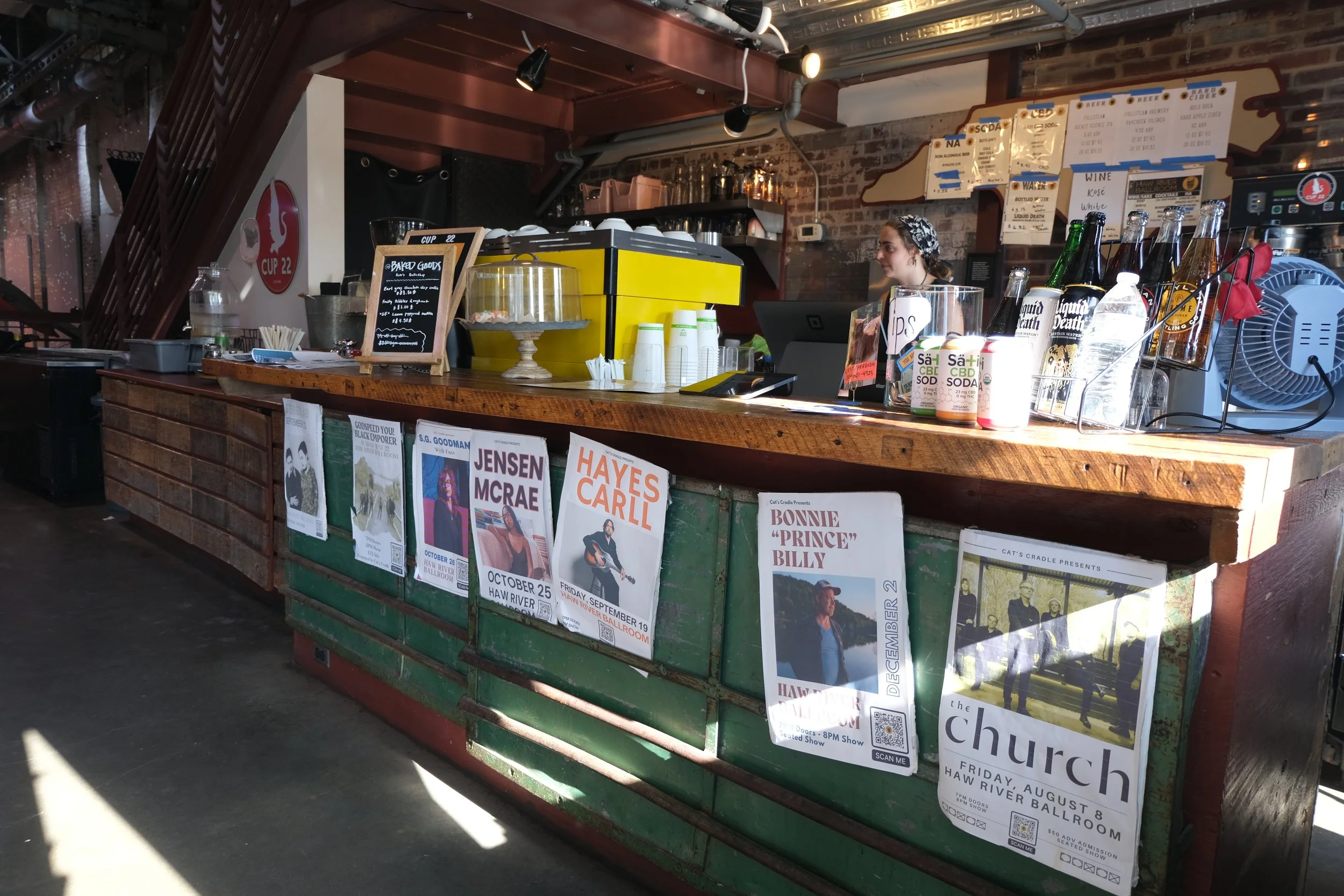 Cup 22 is a beautiful two level riverside coffeeshop located in the Haw River Ballroom in Saxapahaw featuring full service gourmet coffee and teas, espresso everything, frappes and smoothies and locally baked goods both sweet and savory. With riverside outdoor decks, free wifi, beautiful natural light and lots of space for meetings, and meetups and access to walking trails on the river, its a great place to connect with friends, study, watch the sky and the river, write that novel, or get your work done.